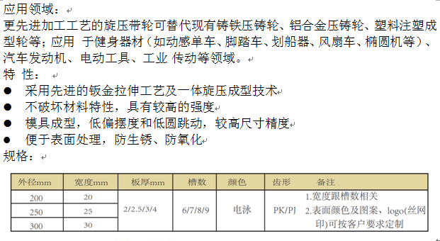 更先进加工工艺的旋压带轮可替代现有铸铁压铸轮、铝合金压铸轮、塑料注塑成型轮等;应用 于健身器材(如动感单车、脚踏车、划船器、风扇车、椭圆机等)、汽车发动机、电动工具、工业 传动等领域。 特 性: l 采用先进的钣金拉伸工艺及一体旋压成型技术 l 不破坏材料特性,具有较高的强度 l 模具成型,低偏摆度和低圆跳动,较高尺寸精度 l 便于表面处理,防生锈、防氧化